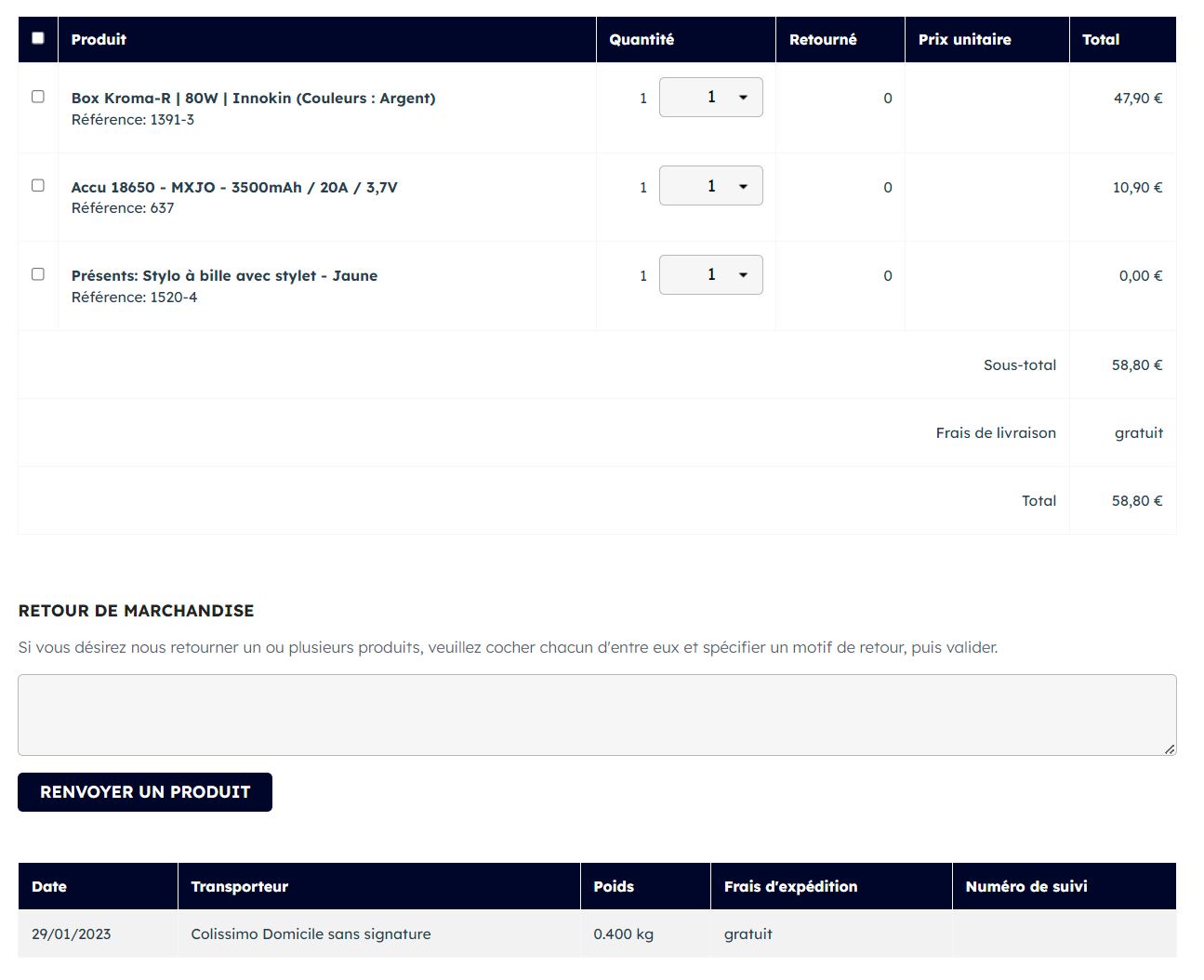Cliquez sur la commande en question puis sur Détails et cochez le/les article(s) à retourner. Complétez également la partie "commentaire" pour nous indiquer le motif de votre demande de retour produits. Finalisez votre demande en cliquant sur le bouton "Renvoyer un produit" :